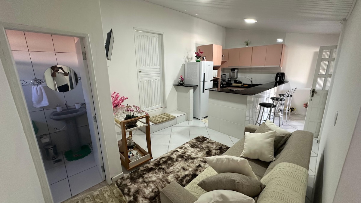 Rumah kecil yang indah, dengan pintu masuk bebas, katil double, dapur lengkap, sofa dan bilik mandi. Saya bersemangat tentang hiasan dan tumbuh-tumbuhan, perinciannya ada di mana-mana, dan ia menjadikan penginapan ini lebih selesa. Datang dan berehat di ruang yang damai dan bergaya ini, dengan pemandangan indah rantau Br yang paling menarik!
