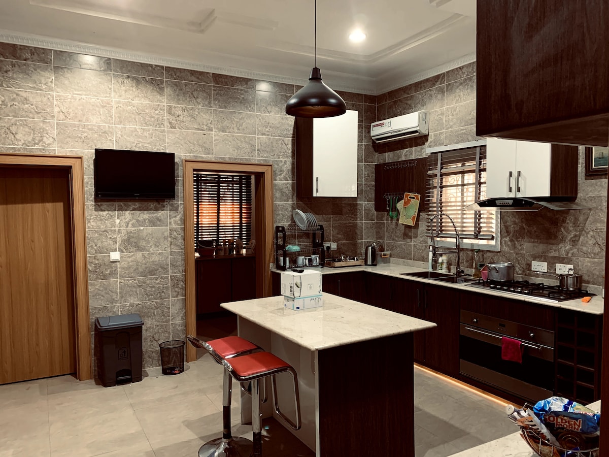 Nikmati penginapan yang seperti rumah sendiri dengan kemewahan dan keselesaan yang ditakrifkan semula. Tempat unik ini mempunyai gaya tersendiri. Rumah kontemporari yang baru dibina di estet selamat yang direka sepenuhnya dengan standard tinggi. Ciri-ciri utama termasuk PS5, elektrik 24/7, wifi serat optik, TV Pintar, Netflix, Dstv, bilik permainan, semua bilik en-suite, pembesar suara wifi dasar super, dll. Pembersihan harian dan kakitangan kemudahan tersedia dengan mudah di tapak.