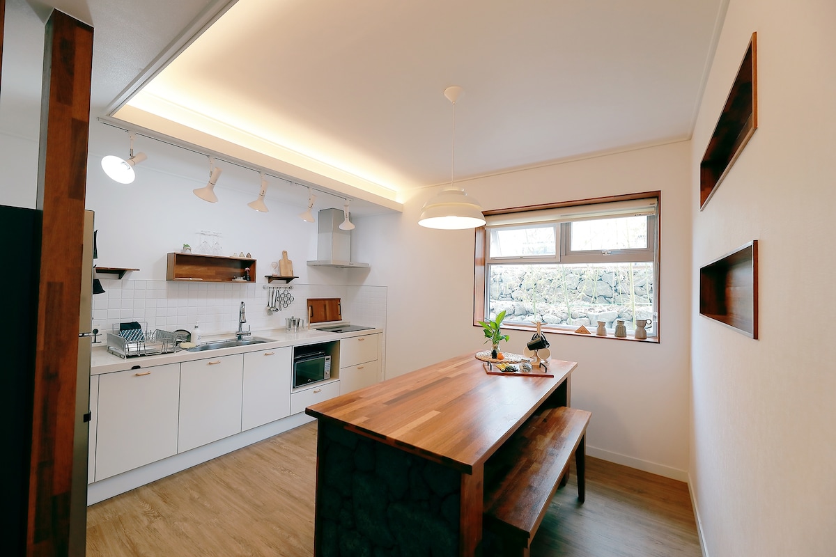 Ia adalah rumah Jeju yang telah dibina sendiri oleh pasangan hos selama setahun untuk memenuhi keperluan pengembara yang ingin tinggal di Jeju. Dikelilingi oleh dinding batu, Jeju dengan taman kecil Ini ialah bilik tingkat bawah yang selesa dan hangat. Ia terletak di pergunungan tengah di barat Jeju, dan ia berhampiran dengan Oreum dan laut. Kami harap anda datang dan berehat dengan selesa seperti di rumah sendiri di Jeju. Walaupun kami membinanya dengan teliti, kami mengutamakan kebersihan dalaman, jadi kami menguruskan bukan sahaja pembersihan, tetapi juga menguruskan peralatan tempat tidur dan tuala dengan teliti. - Makanan Selamat Datang: Roti, Roti, Teh Organik, Kopi, Yujeong Ayah Aewol - Pengangkut: penulen air, periuk nasi, cerek elektrik, mesin basuh, microwave, Wi-Fi, TV, pembesar suara Bluetooth, pengering, seterika wap - Mainan, permainan papan, buku bergambar, buaian rajut - Peralatan makan yang boleh digunakan, kerusi bayi, mandian, penggalak, tandas bayi - Badan, syampu, perapi, kapas, peralatan mandian, kit pertolongan cemas * Harap maklum: Kolam renang hanya dibuka dari Julai hingga pertengahan September * Barbeku tersedia (30,000 KRW berasingan)
