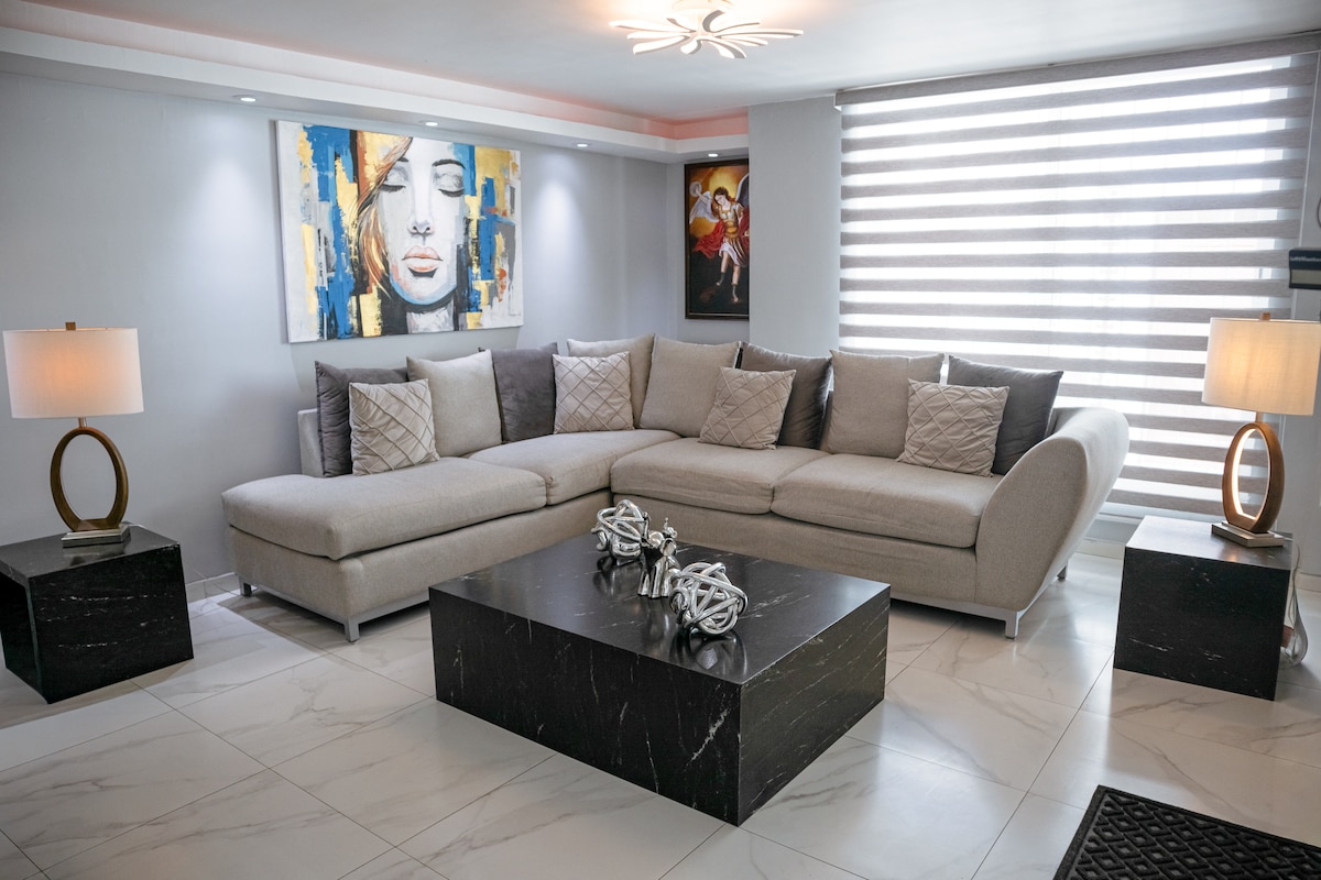 Omega Black, Apartmen Baru 7 minit dari Colosio Av. Pemandangan menakjubkan dari tingkat 8, TV 75", 65" dan 58", teres persendirian, AC Pilihan untuk bilik tidur utama $300 semalam. Pengawal keselamatan 24 jam, tempat letak kereta persendirian, dan 2 lif. Pada masa ini kemudahan Bangunan disekat untuk Airbnb. Pusat komersial dengan Starbucks dan Gold Gym di satu sisi menara. Satu kereta dibenarkan.