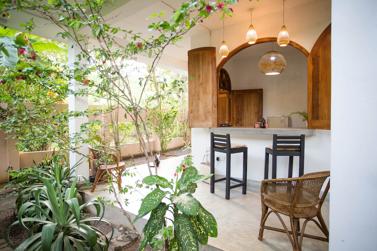*Sekarang dengan sambungan internet serat * Bagi mereka yang sukakan laut, tetapi suka ruang yang tenang untuk berehat jauh daripada orang ramai dan menghayati keindahan alam semula jadi yang ditawarkan oleh kawasan ini. Apartmen katering sendiri terletak di antara ladang kayu manis dan hutan di hujung jalan kediaman di Hikkaduwa. Menaiki skuter pendek atau berjalan-jalan santai ke pantai.
