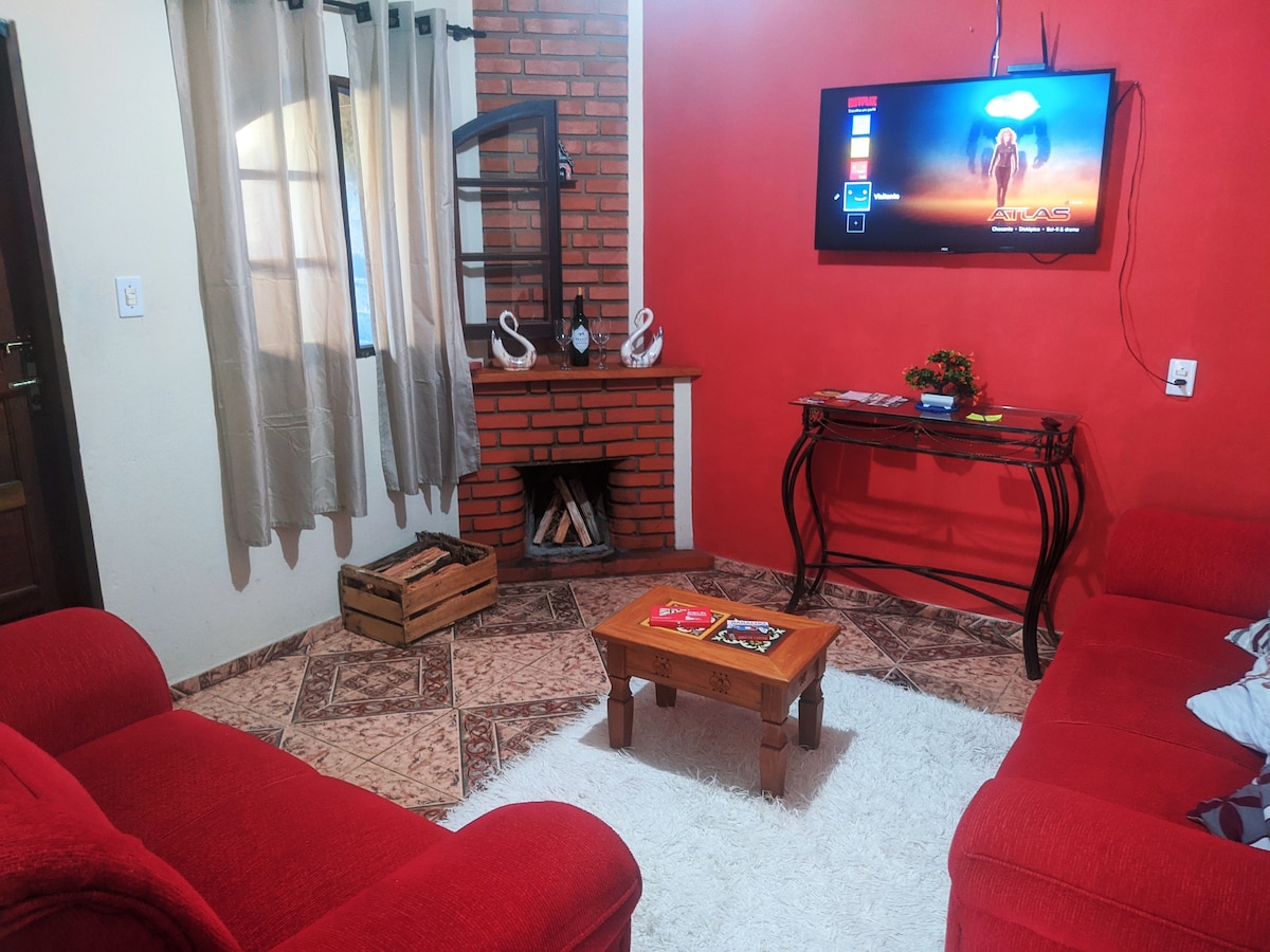 Rumah di Tempat yang Tenang dan Persendirian. Terletak di Maringá, dengan sungai, berjalan kaki dari pusat Maringa. Terletak di tempat yang tenang di mana anda hanya boleh mendengar nyanyian burung. Ia mempunyai 1 bilik tidur dengan 1 katil, satu lagi bilik tidur dengan 2 katil dan 1 mezzanine dengan katil double, ruang tamu dengan TV dan pendiangan yang disepadukan ke dapur dengan dapur kayu dan peralatan asas, balkoni dengan buaian rajut, taman, di kawasan hijau dengan medan rumput. Kami cadangkan anda berjalan kaki ke Vila Maringá dan Maromba untuk mengenali gastronomi dan air terjun.