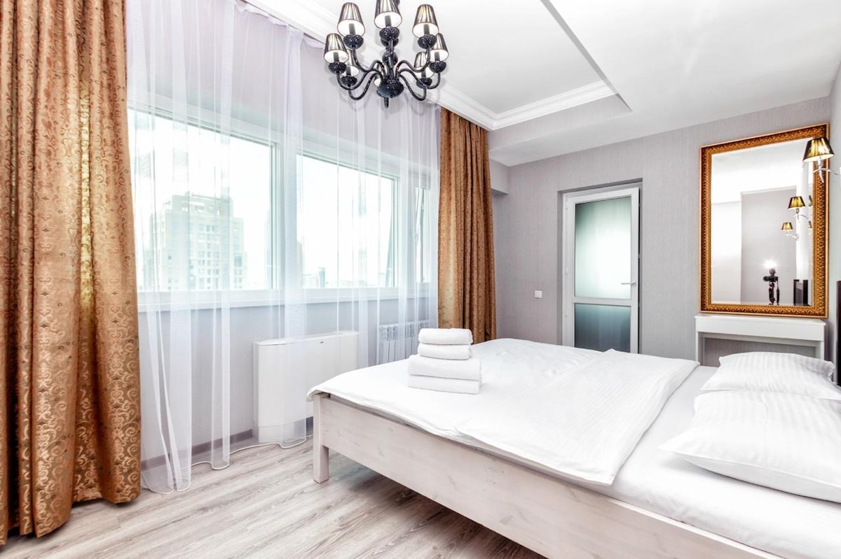 Kompleks kediaman kelas Premium Esil Riverside dengan pemandangan indah menghadap tanggul Sungai Yesil. Apartment ada: - 2 katil besar - Sofa lipat cantik - cadar dan tuala, syampu, sabun badan, sabun - TV, internet berkelajuan tinggi - Mesin Basuh - Iron board, iron board - Dapur lengkap dengan peralatan dan perkakas. Apa yang perlu dilakukan - The Circus - Ailand Water Park - Akuarium - Triathlon Park - Bandar Keruen - Pusat tenis kebangsaan