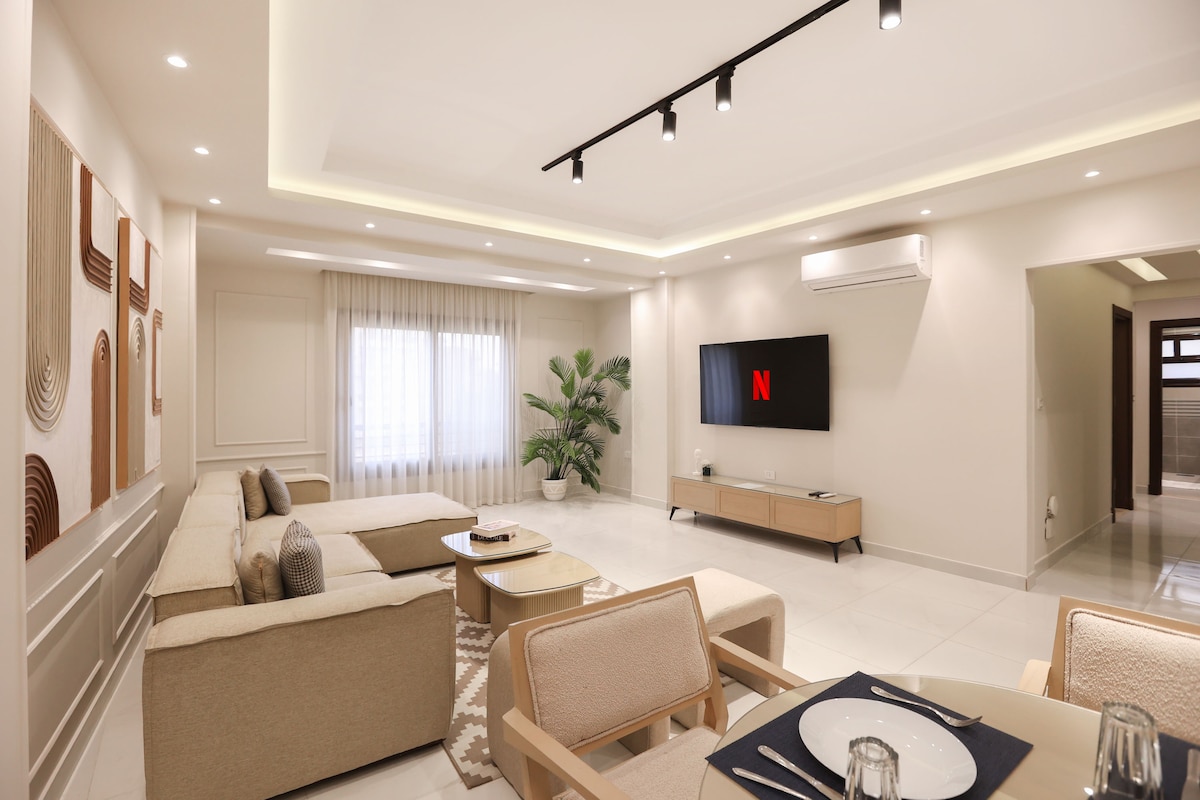 Welcome to Your Perfect Getaway! Experience comfort in our newly furnished Three-bedroom apartment, complete with a fully equipped kitchen and a spacious living area featuring a 55-inch smart TV. Stay connected with high-speed internet! Located in the heart of New Cairo, you’re just a short walk from Waterway Boulevard and nearby attractions. Book now for a memorable stay in our stylish serviced apartments!