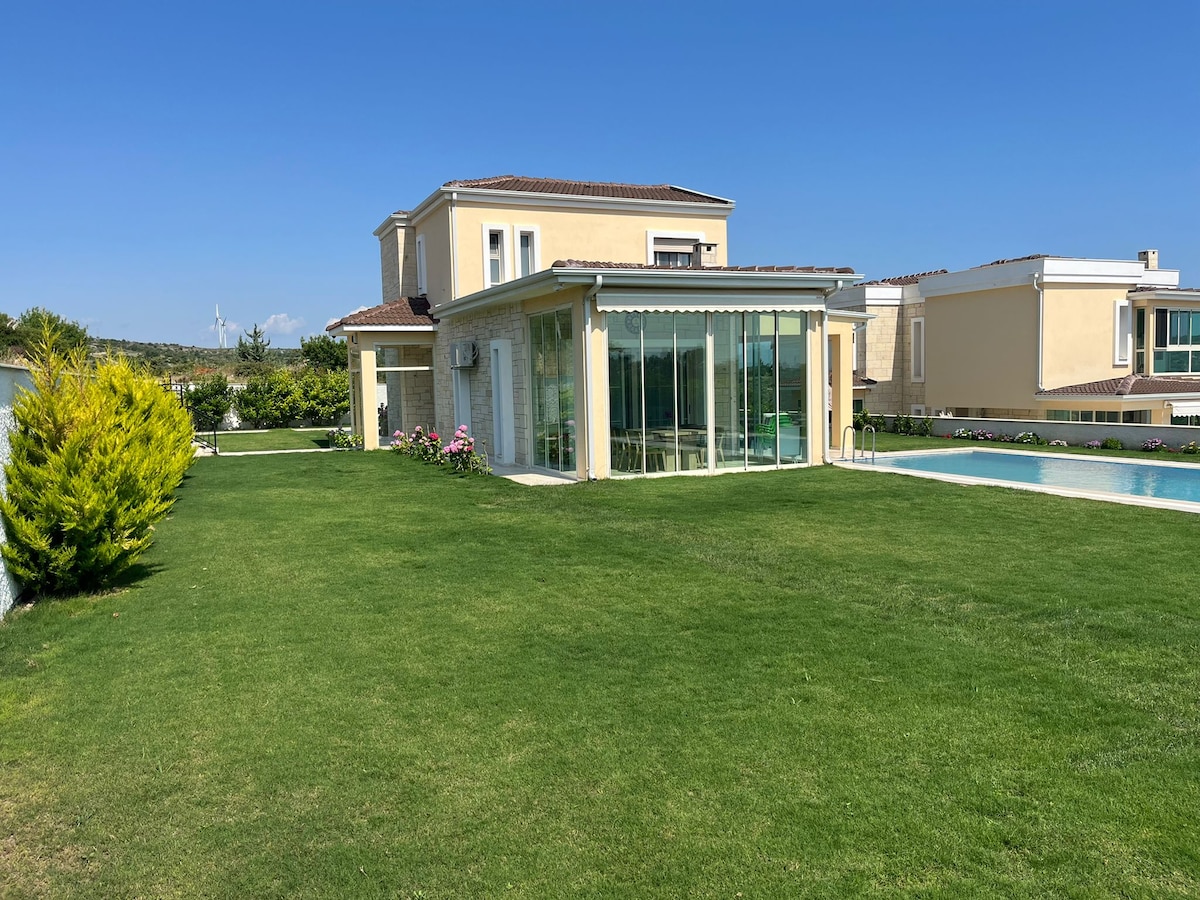 Tepi laut!Pemandangan panorama AegeanSea yang menakjubkan. Kolam renang besar & air pancut air. Teres dengan ketuhar bata kayu tradisional serta BBQ Weber Summit. Banyak ruang duduk/makan/memasak/kaunter. TENAGA Suria 7KW(tiada lagi gangguan!) !Gigabit! FiberInternet! 5 bilik tidur, 5 bilik mandi penuh, dapur lengkap, beranda, ruang tamu besar dengan siling katedral. Ilıca Beach 6min,Alacati 10min,4minit keHotSpring Penginapan yang sesuai untuk keluarga dan rakan yang mencari percutian yang santai.