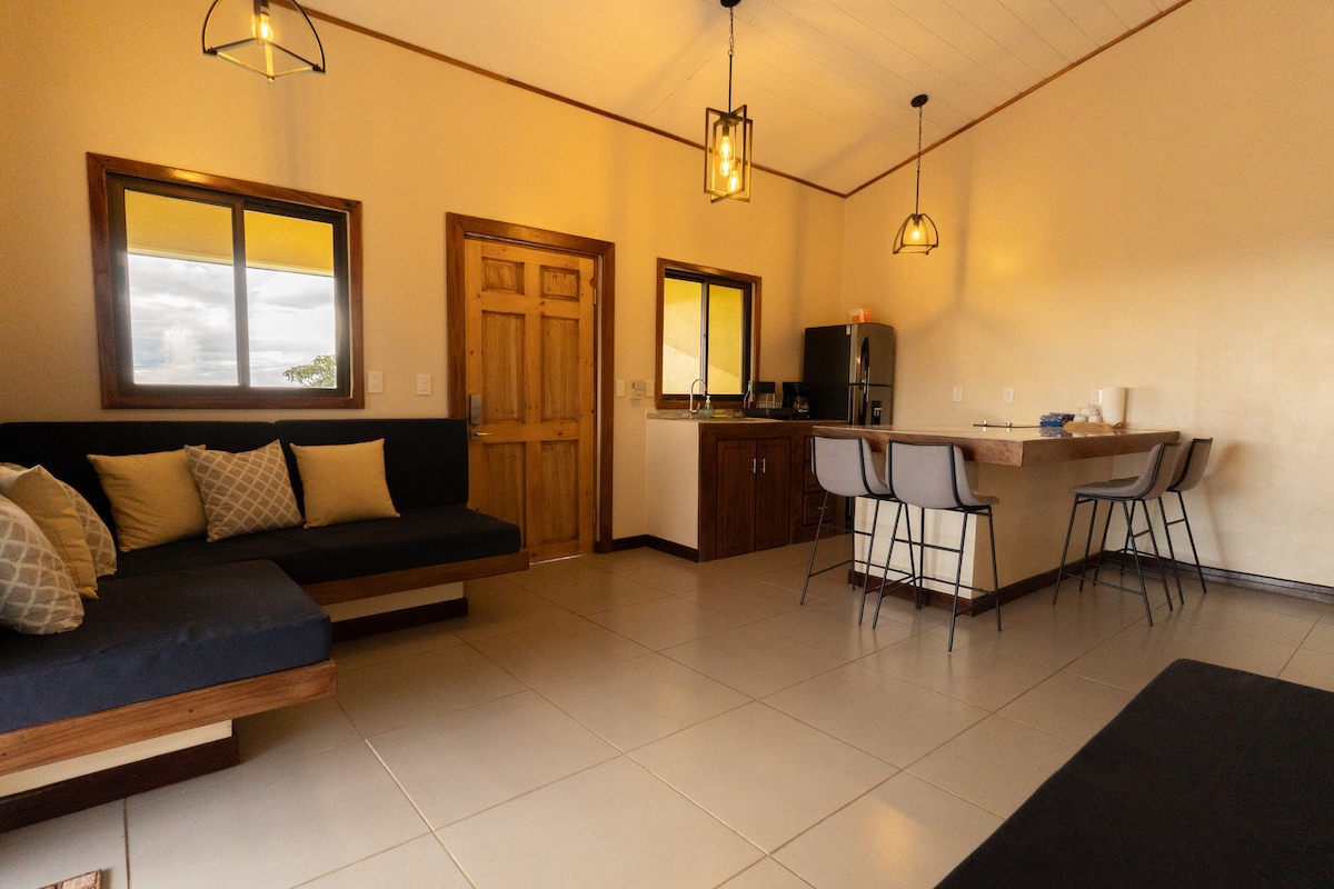 This space is very quiet, enhanced to enjoy nature right from your own terrace. It offers a studio feel with the size of a Casita, offering a Queen bed, a complete bathroom with hot water tank, kitchenette with all the needed cooking utensils, sitting area indoor and outdoor with comfy space, ideal for couples. The forest is your backdrop from this cozy space, it allows you the opportunity to spot tropical bird residents, wildlife, and tropical flowers right from your private terrace.