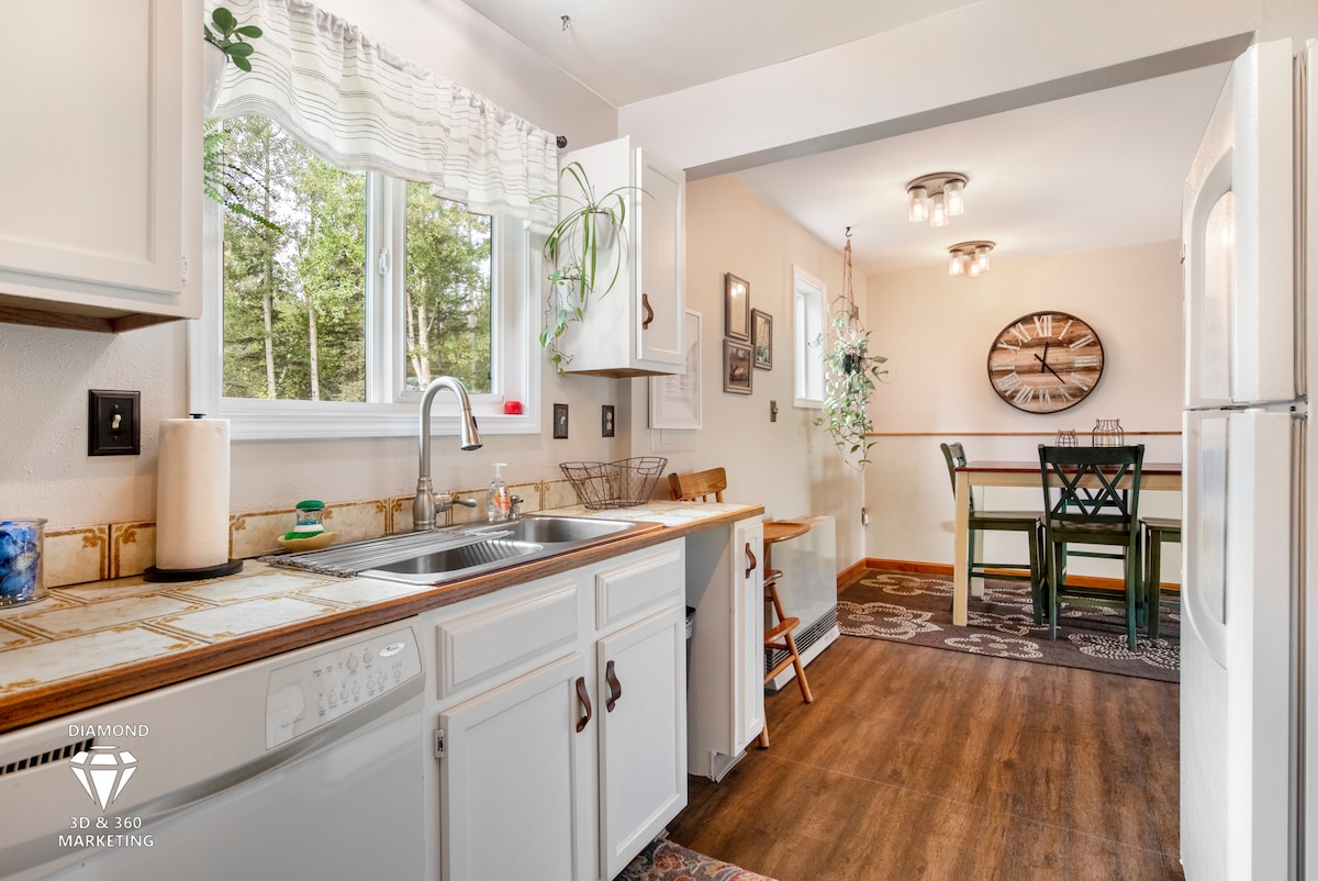 Tingkat bawah Rumah Jewel Lake kami dengan pintu masuk berasingan, dan halaman belakang yang menyeronokkan. Ini ialah pengubahsuaian baru-baru ini; ruang eklektik dengan siling kayu vintaj dan gabungan perincian industri + moden. Kami berjarak 5 minit memandu dari lapangan terbang, dan tetamu boleh menikmati hutan belantara Alaska dari ruang ini. Sistem laluan hutan terletak betul-betul di belakang rumah kami untuk berjalan dan berbasikal. Tetamu boleh mengutip telur daripada ayam kami, menggunakan tab mandi air panas di tepi hutan kami, menyalakan lubang api, atau menggunakan papan kayuh di Sand Lake.