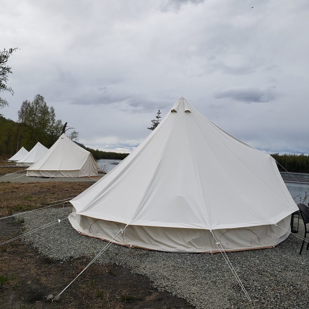 Berhubung semula dengan alam semula jadi pada percutian yang tidak dapat dilupakan ini. Terletak di pinggir sungai Sungai Knik di Palmer, Alaska, khemah glamping kami menawarkan pengalaman yang unik. Cabut palam, berehat dan bersantai di khemah loceng gaya kanvas kami. Setiap khemah dilengkapi dengan satu katil queen, linen, permaidani, hiasan bergaya dan kemudahan lain. Hanya 45 minit ke utara Anchorage, lokasi kami menawarkan pemandangan yang luar biasa dengan akses kepada semua perkara di luar! Juga sesuai untuk majlis perkahwinan mikro, percutian & perhimpunan kecil!