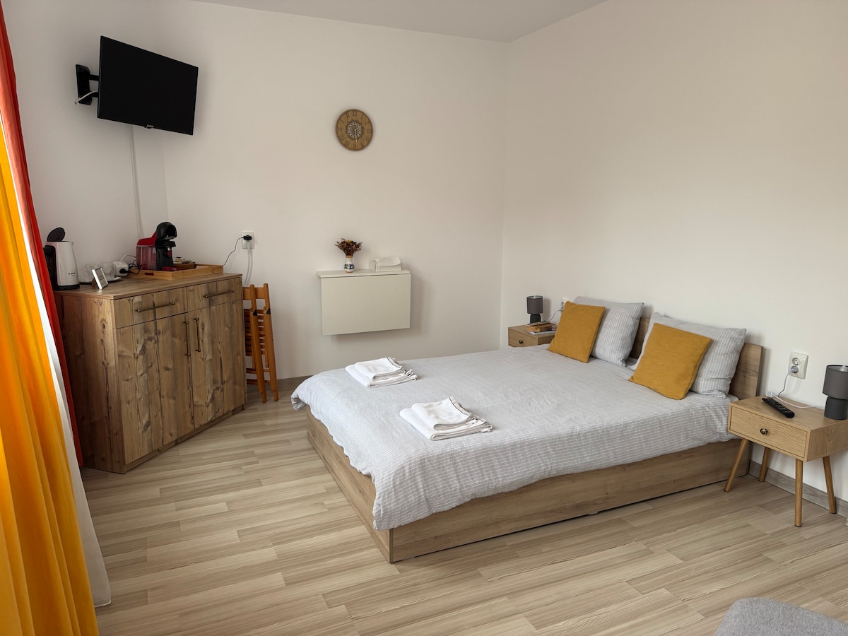 Fully new 50 m² apartment located within a private house divided into two independent units, managed by the Turcu family. The apartment has a private entrance and private parking, shared only with the owners. It offers a bright, spacious bedroom with a 160 cm bed, living-dining area with a fully equipped kitchen, Netflix, and a modern bathroom with walk-in shower and washing machine. Quiet residential area, 12 minutes from the city center, bus stop nearby and supermarket within walking distance.
