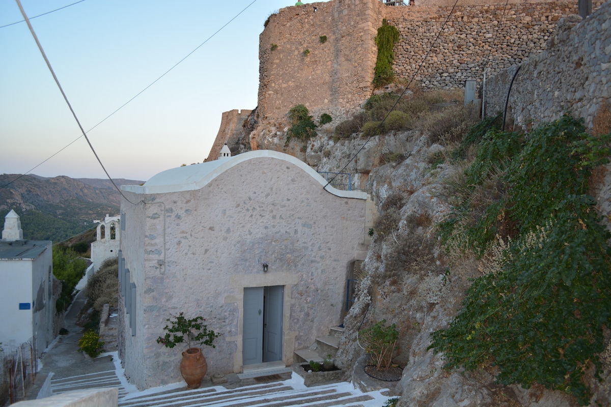 Terletak di Chora, vilage utama pulau ini, apartmen ini hanya beberapa meter dari restoran dan bar yang paling indah di pulau ini, namun, pada masa yang sama terpencil daripada bunyi bising kehidupan malam. Bilik tidur ini terletak dalam gaya gua tradisional (tiada tingkap), manakala dapur dan ruang tamu mempunyai banyak cahaya semula jadi dan (dua tingkap besar dan pintu kaca) menghadap laut dan bukit yang didiami.