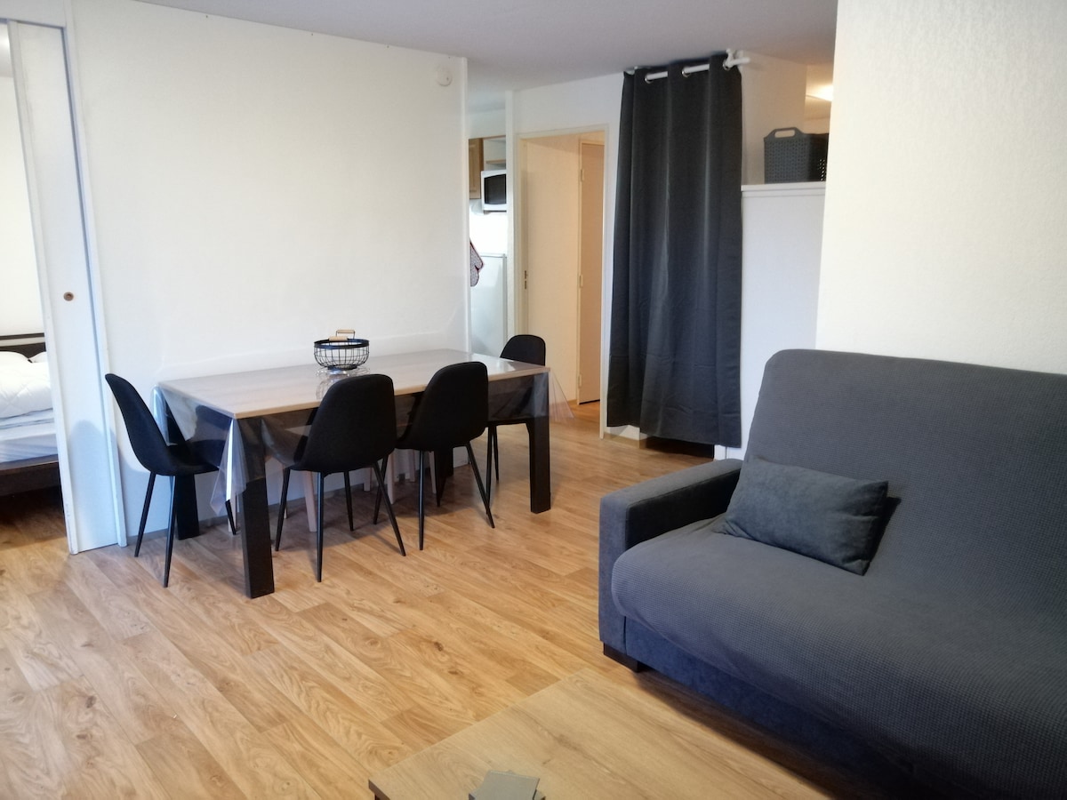 Tingkat 4 menghadap teres ke selatan. Apartmen ini menempatkan 6 daripada 35 m2 100m dari cerun. -1 katil dua tingkat 2X1 orang di sudut gunung. -1 sofa untuk seorang + 1 katil tarik keluar untuk 1 orang di ruang tamu. -1 katil double 160 di dalam bilik - Apartmen dan dapur lengkap untuk 6 orang (mesin basuh pinggan mangkuk/pembuat kopi/pembakar roti/plancha dll. - selimut dan bantal disediakan. -TV - Kawasan santai di kediaman yang termasuk dalam sewaan (kolam renang/hammam/sauna) dibuka mengikut musim.
