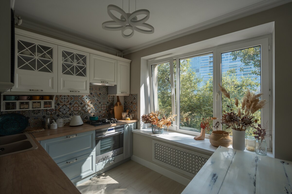Apartmen bergaya di tengah-tengah Almaty — di persiaran Esentai, bersebelahan Esentai Mall, taman dan restoran terbaik di bandar. Lukisan dinding yang unik, pendiangan yang selesa, hiasan berjenama dan pemandangan gunung dari tingkat 4 mewujudkan suasana keselesaan dan inspirasi. Dapur serba lengkap, peralatan, gelas wain dan pelbagai jenis teh yang jarang ditemui. Untuk tetamu yang menginap 5 malam atau lebih, sebotol Wain Arba Kazakhstan sebagai hadiah. Ruang seluas 48 m² ini sesuai untuk pasangan, perjalanan kreatif atau perjalanan solo.