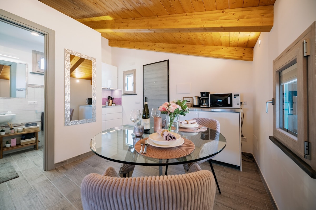 The independent house is a unique unit (15 sq.m.) comfortable well furnished: double bed,aircond, central heating, TV,bathroom with shower, kitchenette (2 gas fire) and a mini bar fridge.There is also an open space (20 sq.m.) covered whith pergola, a shower outside and the table that can used for breakfast or dinner.The panoramic garden (50 sq.m.) with sun beds and the seaview terrace on the roof whit confortable bench and table.You can share private free parking for medium car