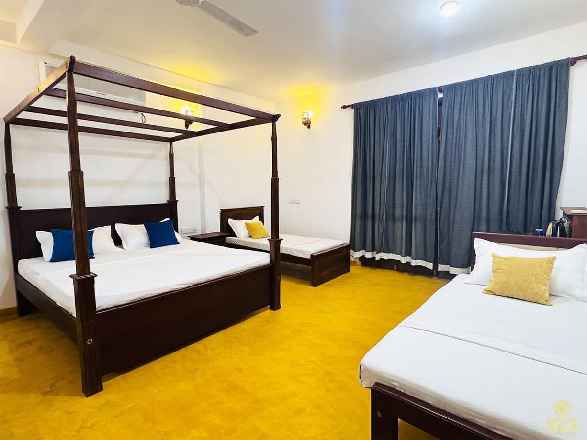 Ini adalah apartmen tingkat pertama di sebelah kanan, sebahagian daripada apartmen dua bilik tidur. Bilik ini dilengkapi dengan bilik mandi bersambung yang menampilkan air panas dan dilengkapi dengan pendingin hawa. Anda akan mendapat akses kepada dapur berkongsi dan ruang tamu, lengkap dengan semua kelengkapan dapur dan mesin basuh. Di luar, anda boleh menikmati taman hijau yang indah dengan kolam renang, di mana anda boleh melihat burung dan monyet. Ia tempat yang tenang dan santai, hanya 7 minit berjalan kaki ke pantai meluncur Hikkaduwa yang terkenal.