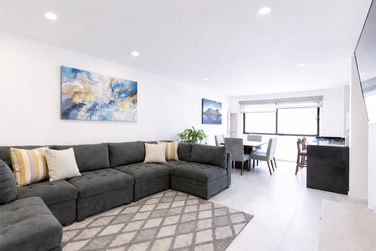 Enjoy a spacious and elegant penthouse with a prime location. Perfect for short or long stays, we offer a laundry center and secure private parking. Just steps away, you’ll find supermarkets, pharmacies, restaurants, and convenience stores. In addition, the area offers a wide variety of recreational activities: ice skating rink, bowling, billiards, casino, nightclubs, and cinema. Angelópolis area is 5 minutes away, and the historic center only 10 minutes.