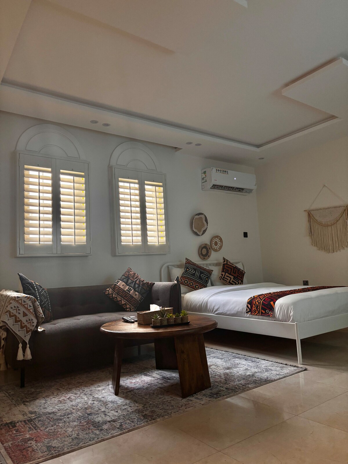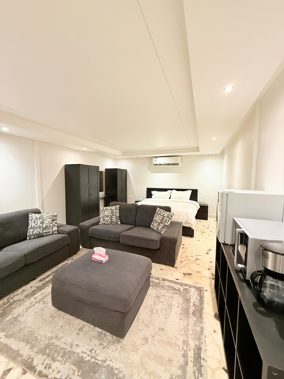 Studio yang elegan dan tenang dengan kemasukan sendiri (pintar), terdiri daripada bilik tidur dan tempat duduk sisi dan televisyen pintar yang mengandungi YouTube dan Netflix serta sudut khas untuk kopi dan peti sejuk dan tandas persendirian. Studio ini tenang dan mempunyai privasi penuh dan terletak di kawasan kejiranan Al-Nuzha berhampiran persimpangan Jalan Abu Bakr Al-Siddiq dengan Jalan Raja Abdullah.