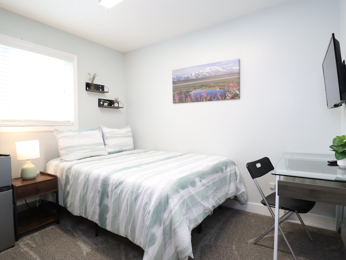 Baru sahaja diubah suai dan dikemas kini! Studio persendirian yang luas di kawasan Turnagain/Spenard yang bergaya. Terletak berhampiran dengan pusat bandar, lapangan terbang Ted Steven dan tengah bandar! Satu batu dari Safeway Carrs dan jarak berjalan kaki singkat ke Coastal Trail, perhentian bas, taman perbandaran dan restoran/kedai kopi/bar Rustic Goat. Ruang yang sesuai untuk pasangan, keluarga dan pengembara tunggal daripada semua latar belakang. Menarik dari segi estetika, cahaya semula jadi yang banyak, lapang, menghijau dan banyak kemudahan.