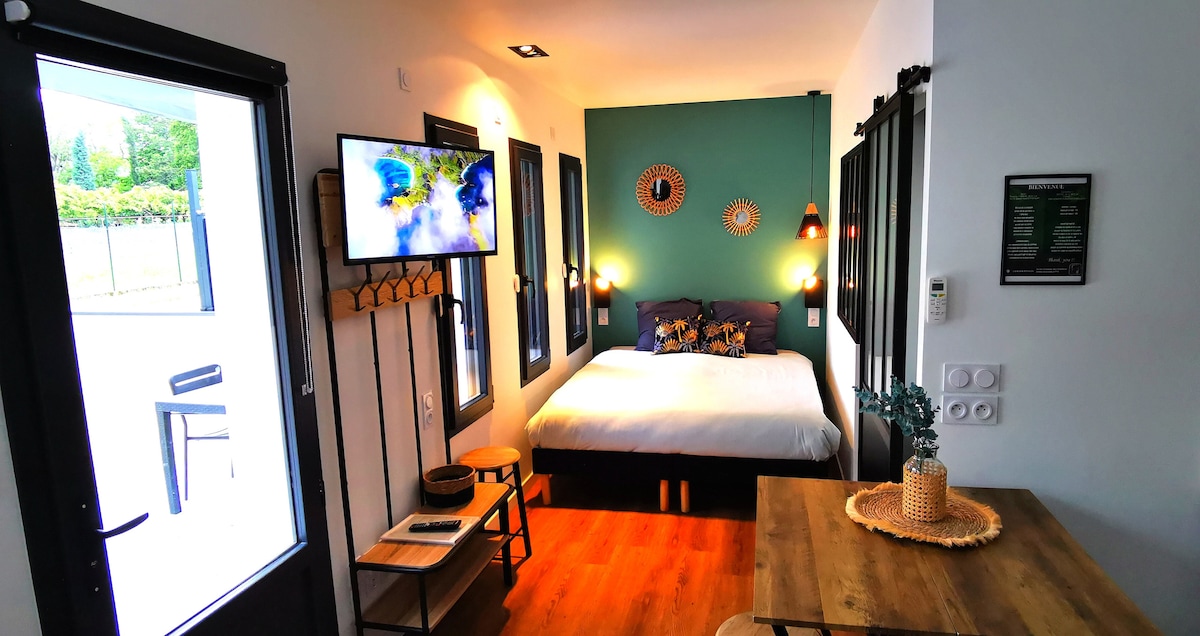 Berehat dan berehat di oasis yang damai ini. Kepompong moden dan berhawa dingin seluas 32m2 dilengkapi dengan bahagian luarnya yang indah dengan 1 kolam renang dan 2 teres termasuk 1 tertutup dan berperabot tanpa vis-à-vis. Ia menawarkan anda semua keselesaan yang anda perlukan untuk penginapan anda dengan kami sama ada anda keluarga, rakan, pasangan atau untuk penginapan profesional. Berhampiran dengan viarhona, coklat valrhona, taman haiwan skingres, istana faktor kuda, pilat.