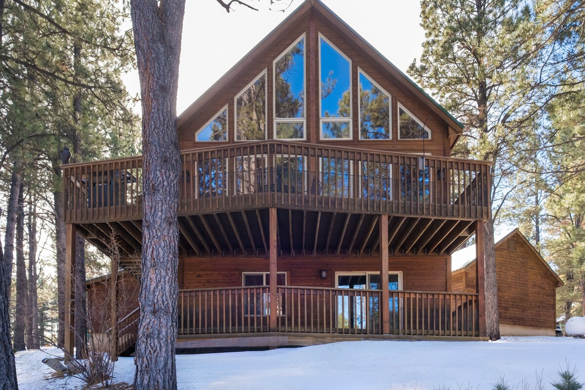 Nikmati kabin 2 bilik tidur dan bilik mandi yang luas ini yang terletak hanya beberapa minit berjalan kaki dari Mont Verde Lake dan Cougar Trail Head dan hanya 8 minit dari Angel Fire Ski Resort. Dengan 2 bilik tidur utama dan 2 bilik tidur yang lebih kecil, ia mempunyai banyak ruang untuk kumpulan besar. Bersantai di tepi dapur kayu yang indah di ruang tamu yang luas atau berendam di tab jakuzi selepas seharian berski atau mendaki. Nikmati pemandangan salji dan hidupan liar tempatan sambil menikmati kopi anda di tingkap besar kami atau di dek yang luas.