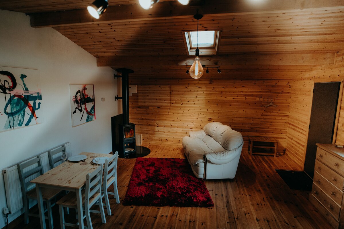 Rumah kayu gaya Alpine yang moden, ringan dan lapang dengan bilik tidur/lounge pelan terbuka yang indah dengan penunu balak yang lazat. Dapur moden dengan ketuhar berganda, dapur 4 ring, mesin basuh pinggan mangkuk. Ruang makan. Pancuran hujan berjalan masuk, pemanas radiator/tuala dan pemanas bawah lantai. Roku TV, wifi jalur lebar, mesin basuh dan pengering. Tempat letak kereta di dalam kawasan taman persendirian, berpagar sepenuhnya, selamat untuk anjing. Penggunaan eksklusif tab mandi air panas. Katil superking yang selesa :) Sila tambah yuran haiwan peliharaan kepada tempahan, terima kasih! 25 minit ke Zip World.