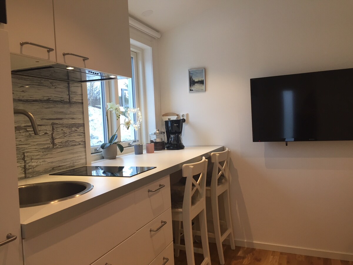 Cozy mini house in the best central location in Duved. 1 room with sleeping alcove, 2 beds, 2 minutes to everything! Nearest neighbor is the Byliften ski lift — best Ski-In & Ski-Out location! The small house has all you need: built-in 120 cm wide bed with 90 cm bed above, fully equipped kitchen for two, TV, WiFi, tiled bathroom with shower and underfloor heating. White walls and oak parquet floors. Outside is a small south-facing patio with table and chairs. Access to a grill.