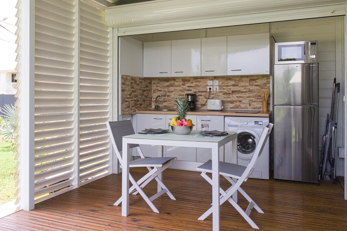 Kami mempersembahkan kotej, teres, taman persendirian, tidur 2 orang dewasa +1 enf Dalam warna Hindia Barat dengan semua keselesaan yang anda perlukan untuk memanfaatkan sepenuhnya penginapan anda Dengan keluasan 35m2, kawasan taman /teres seluas 55m2, untuk menikmati tidur siang di buaian rajut di bawah naungan kayu putih, kolam renang komunal dengan chalet(2 orang), dikelilingi oleh pengganda. Jakuzi Persendirian Tangki air Tempat letak kereta persendirian Kopi, teh, teh herba, air, dan rum diatur untuk ketibaan anda