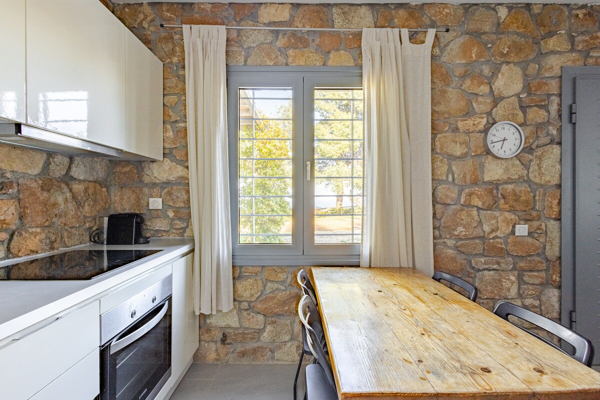 Rumah batu yang baru dibina ini terletak di tengah-tengah pokok zaitun dan pain seluas satu ekar dan menawarkan pemandangan Laut Aegean dan Athos gunung holly yang tiada tandingan. Diasingkan sepenuhnya daripada rumah-rumah jiran, hanya 300 meter dari pantai berenang berpasir yang tidak kotor dengan air sejernih kristal. Rumah mesra keluarga yang terdiri daripada dua bilik tidur ini, dilengkapi dengan perabot yang direka khas, oleh tukang tempatan. Tempat yang sesuai untuk memulihkan dan meremajakan diri.