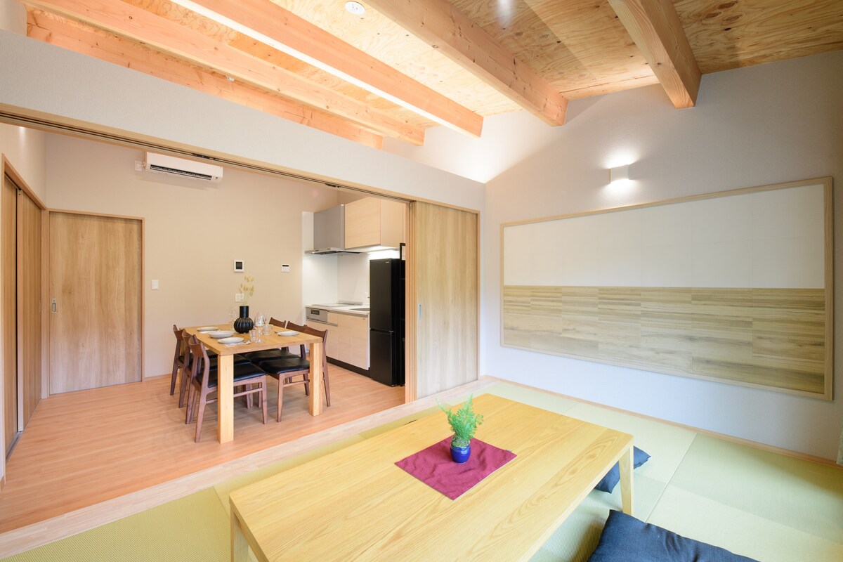 Berjalan kaki 12 minit dari Stesen Hakone-Yumoto, bangunan dua tingkat 113㎡ yang dibina pada tahun 2023 ini mempunyai dua bilik tidur dan ldK 30㎡, dan boleh memuatkan sehingga 8 orang. Ruang makan kecil bersambung dengan teres BBQ dengan pemandangan banjaran gunung Hakone. Ruang tamu dilengkapi dengan kusyen manik yang selesa, sistem bunyi Marshall dan TV definisi tinggi untuk masa yang santai. Selepas menikmati bersiar-siar di Hakone, sila datang dan nikmati ruang luar biasa di "Hako-Reiro".
