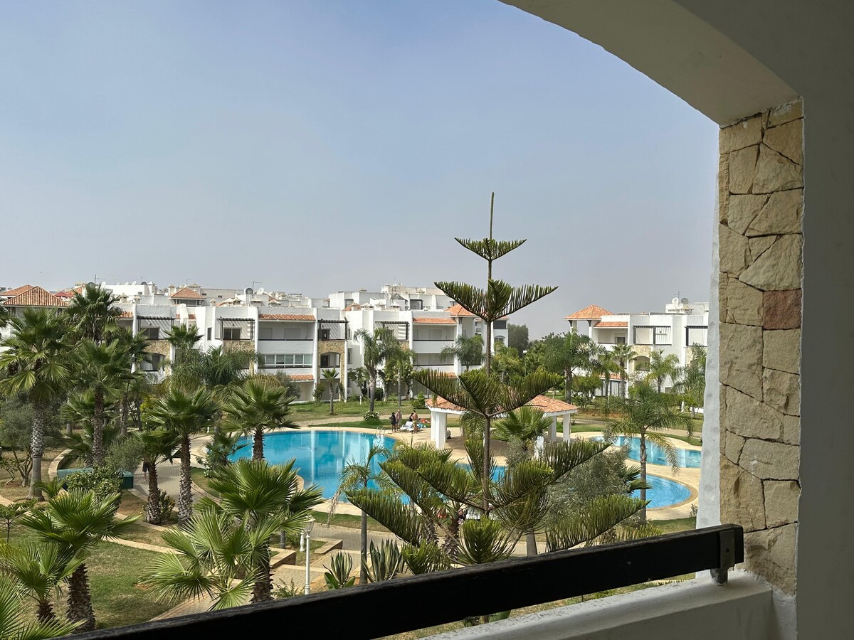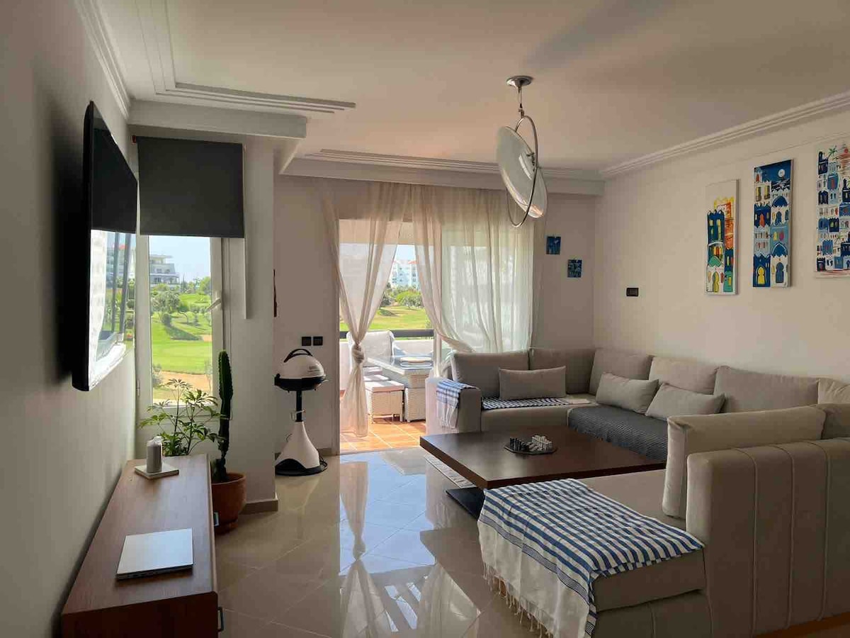 apartmen untuk 5 orang (1 bilik tidur dengan katil kelamin dan 3 bangku yang sangat selesa di ruang tamu), balkoni kecil di mana anda boleh mengambil makanan anda. di kediaman golf Asilah. Banyak kolam renang, tenis, golf 9 dan 18 lubang. Menghadap padang golf dan laut. Keadaan sempurna. Serba lengkap. Aircond/Pemanas. Wifi, TV