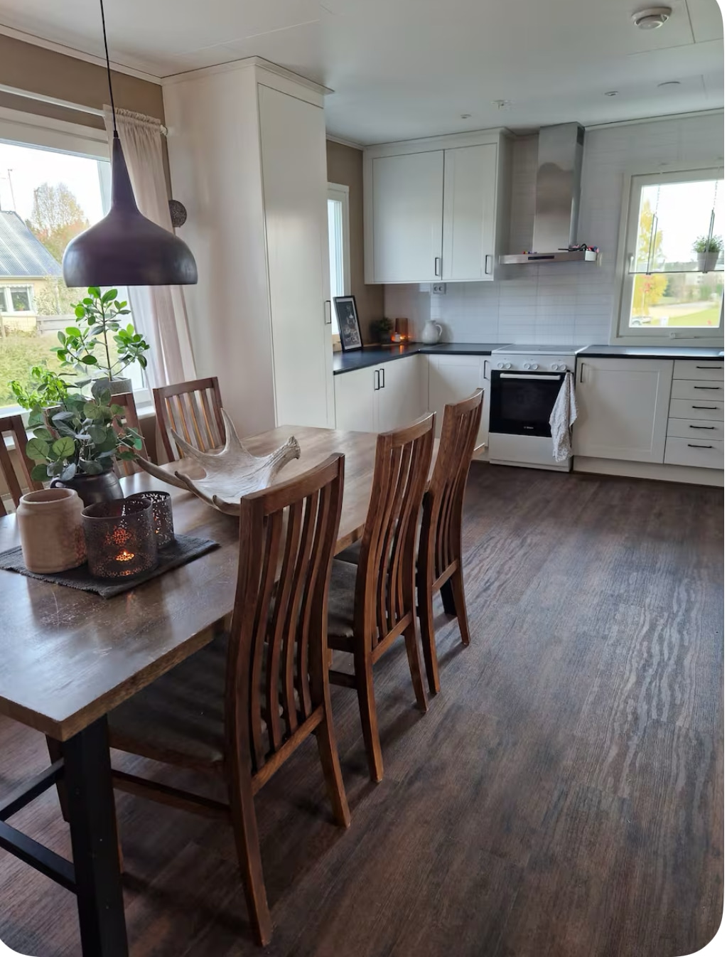 Di sini anda akan menemui sebuah pondok yang menawan dalam suasana yang tenang dan dekat dengan alam semula jadi. Sauna dan tempat barbeku di balkoni dengan pemandangan yang menakjubkan. Jarak ke air adalah 50 meter. Terdapat juga pelbagai aktiviti di kawasan ini. Kondominium ini mempunyai pemandangan tasik, aktiviti memancing, hutan, aktiviti mendaki dan tempat berenang di sekitar kawasan rumah. Pondok ini dihias dengan kemudahan yang anda mungkin perlukan. Terdapat pendiangan yang menjadikan rumah ini lebih selesa jika boleh. Wifi tersedia.