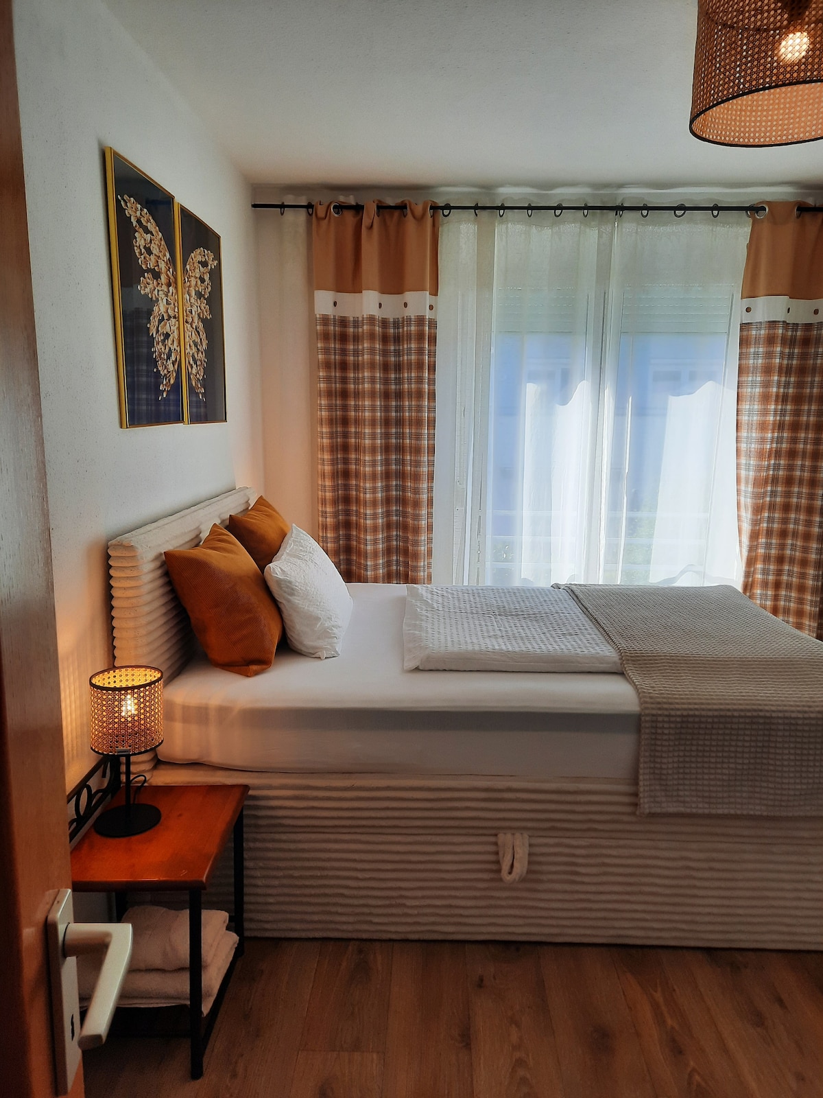 Dein Zimmer ist im Glamour Stil mit modernen goldenen Akzenten eingerichtet. Das 35m² Studio enthält ein BOXSPRINGBETT, SMART-TV mit gratis NETFLIX & WIFI, Küchenzeile + NESPRESSO und kostenlose Parkplätze. Das Appartement befindet sich im Hotelturm - Wahrzeichen & höchstes Gebäude Augsburgs, fußläufig in die Innenstadt (10/15 min) + zum HBF. Du wohnst in einer der höchsten Etagen. Genieße bei schönem Wetter den Blick über Augsburgs Alpen.
