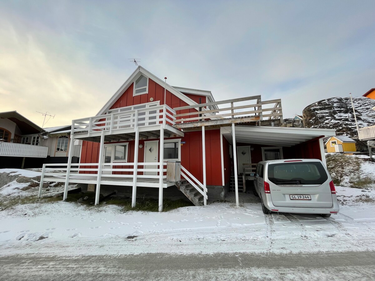 Autentisk grønlandsk dobbelthus, med hems. 35 m2 vestvendt terrasse med aftensol og spektakulær havudsigt til Diskobugtens isfjelde og Diskoøen. Mulighed for hvalkig. Huset er beliggende højt i roligt hus kvarter for enden af lille lukket vej. Kort gå afstand til indkøb i bymidte (købmand og 2 supermarkedet), restauranter, tæt på "Gul Vandrerute" til Isfjorden. Boligen er velegnet til 3 personer, men kan benyttes af 4, ikke børn under 8 år, (1 dobbeltseng, 1 sovesofa og 2boksmadrasser (hems)