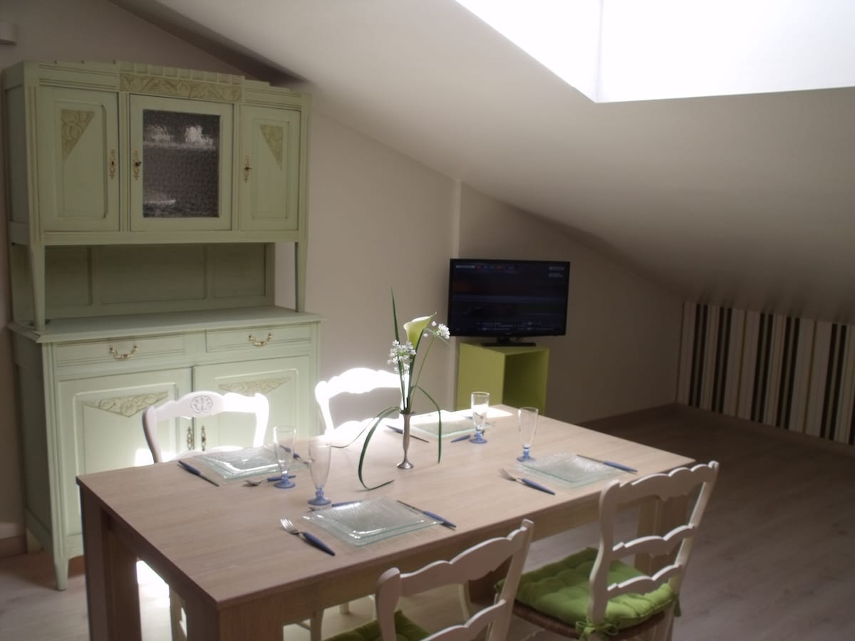 Dilengkapi perabot yang diklasifikasikan (atter) Perhatian loteng yang dilengkapi dengan loteng. Ruang terbuka dan komunikasi ruang tidur yang dipisahkan hanya oleh panel sekatan. Apartmen "ANIS" di loteng berperabot 35m² berguna di tingkat 2 tanpa lif; Internet dengan serat. Perkhidmatan berdekatan kurang daripada 200 meter: kedai roti, farmasi . Juga sedia membantu anda, mesin basuh pinggan mangkuk, mesin basuh,ketuhar gelombang mikro, pembakar roti, pembuat kopi, tandas berasingan. Tempat letak kereta awam percuma di hadapan pintu.