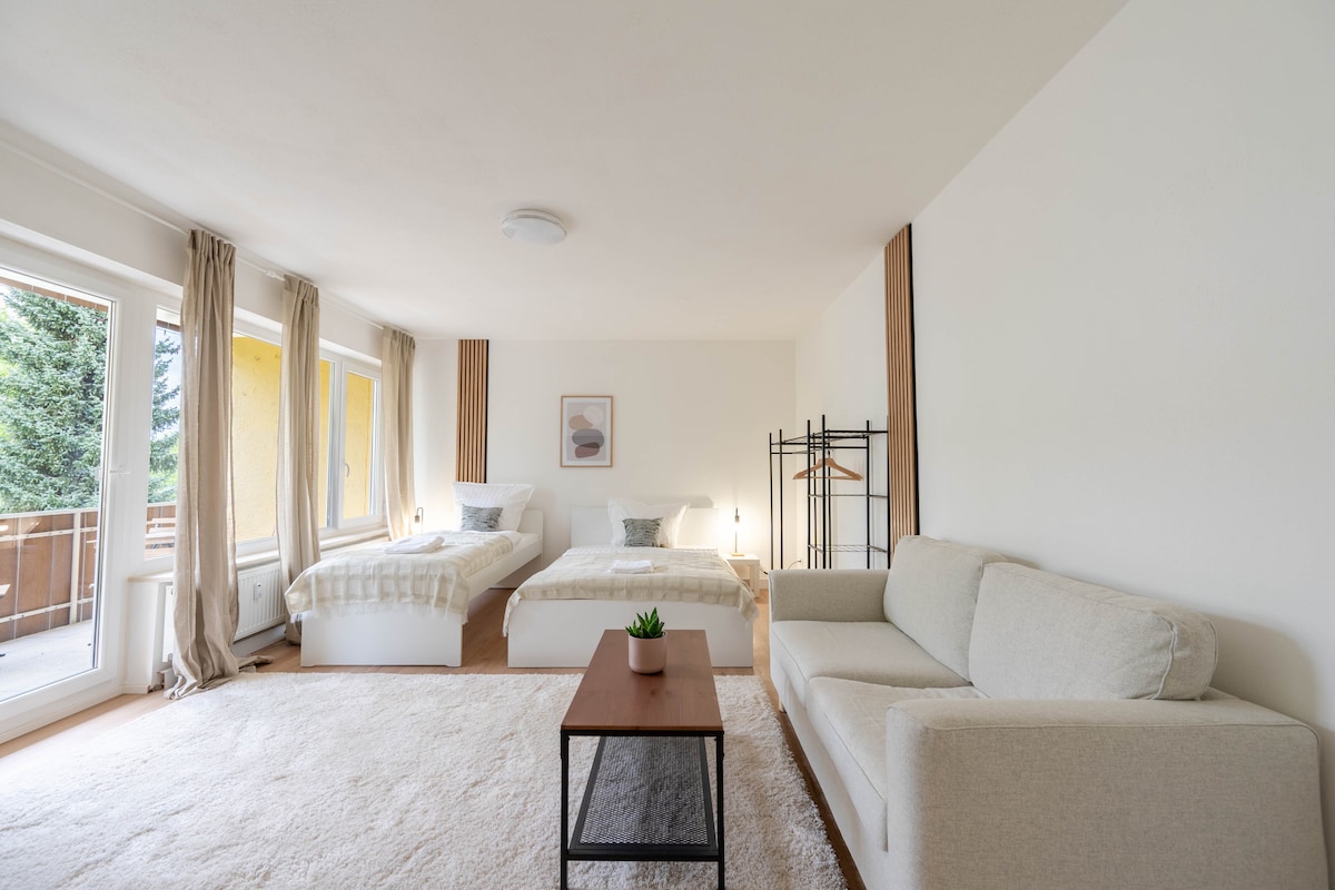 Baru dibina pada tahun 2023 dalam suasana bangunan kilang bersejarah kami, apartmen reka bentuk yang lengkap dengan 46 m2 adalah kem asas Stuttgart anda dan menggabungkan suasana loteng yang unik dengan keselesaan hidup yang paling moden. Stadtbahn, S-Bahn, bas, lebuh raya persekutuan: Sambungan ke pusat bandar Stuttgart (10min), Ibu Pejabat Mercedes-Benz (5min) atau rantau ini adalah optimum. Katil spring kotak premium, dapur berjenama lengkap, ruang kerja tingkap yang luas, dan bilik mandi siang hari eksklusif.