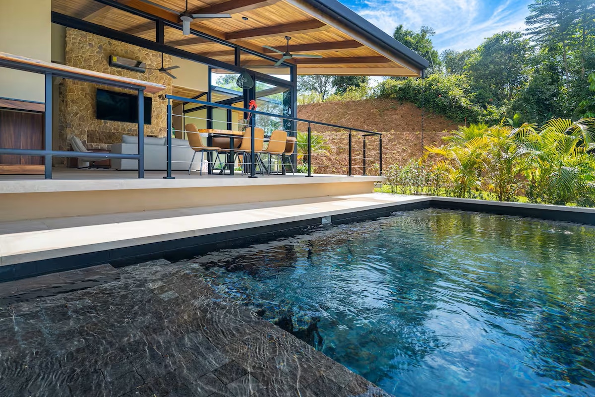 Tempat penginapan bergaya ini sesuai untuk kumpulan kecil atau perjalanan keluarga. Dengan halaman belakang yang besar dan kolam renang persendirian, menjadikannya tempat yang sesuai untuk berehat dan menikmati perjalanan anda dalam privasi rumah anda sendiri. Panggang beberapa makanan dengan minuman sejuk kegemaran anda di tepi kolam renang, nikmati pemandangan terbuka padang besar di belakang rumah. Jangan terkejut jika anda mendapat beberapa lawatan daripada pelbagai hidupan liar kami yang kami ada di sini di Costa Rica, termasuk monyet howler, toucan, macaw, dan sloth sekali-sekala.