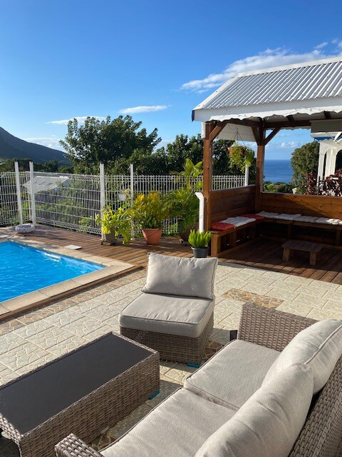 Banglo yang dihiasi dengan citarasa menawan yang terletak di antara laut dan gunung, menawarkan pemandangan Saintes dan Marie-Galante yang luar biasa dari teres kayu yang indah dengan jakuzi. Tetamu boleh menikmati laut setakat mata memandang dan menikmati keselesaan setiap bilik yang dibuka kepada bahagian luar. Lokasi yang sempurna untuk mengakses air terjun carbet 10min, stesen feri untuk Saintes 7min, pantai pasir hitam 3min, Soufrière 25min.. Sesuai untuk keluarga, rakan-rakan...
