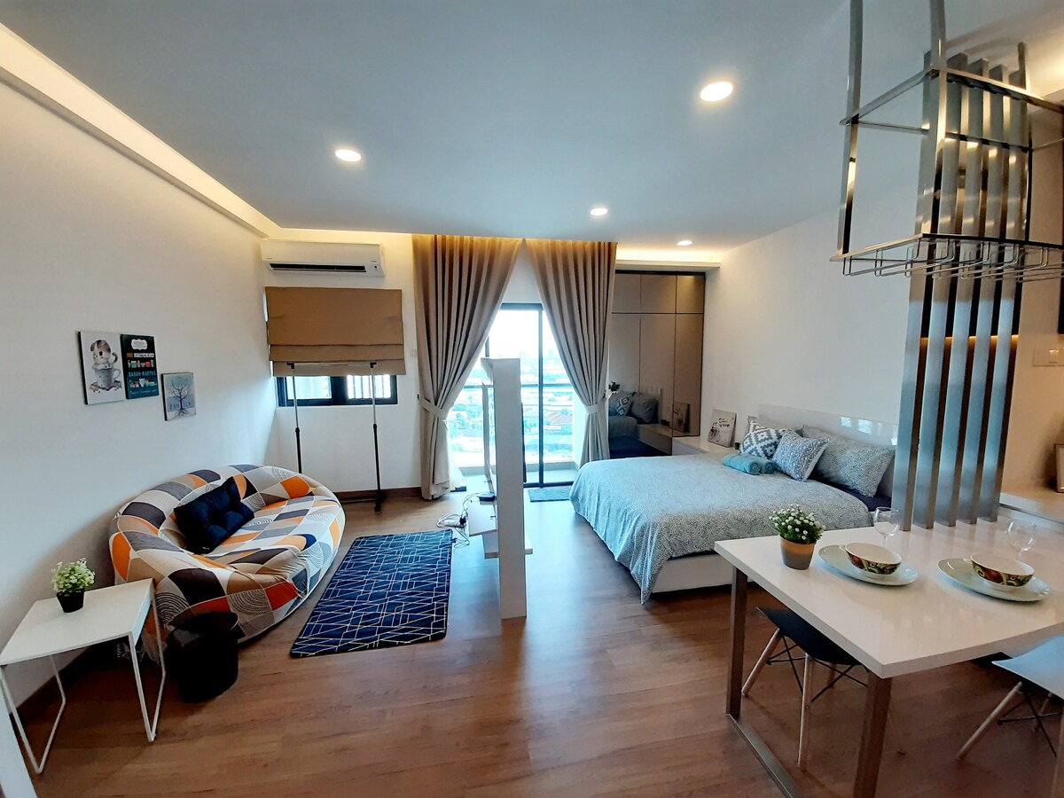 Selamat datang ke studio anda yang luas - syurga serba boleh dan selesa. Meja pelbagai fungsi berfungsi sebagai meja solek, ruang makan dan belajar. Dapur kecil menampilkan peti sejuk moden dan pantri. Dobi sangat mudah dengan mesin basuh/pengering dalam unit. Katil bersaiz king yang mewah untuk malam yang tenang. Ruang tamu mempunyai TV pintar skrin besar untuk hiburan. Percutian yang serba lengkap ini menggabungkan gaya dengan fungsi, memastikan pengalaman hidup yang menyeronokkan. Selamat pulang ke rumah untuk keselesaan dan kemudahan dalam setiap perincian.