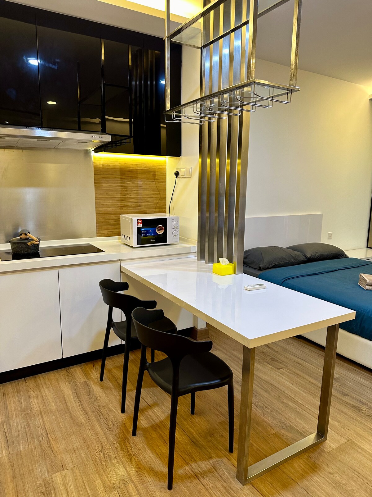 Selamat datang ke studio anda yang luas - syurga serba boleh dan selesa. Meja pelbagai fungsi berfungsi sebagai meja solek, ruang makan dan belajar. Dapur kecil menampilkan peti sejuk moden dan pantri. Dobi sangat mudah dengan mesin basuh/pengering dalam unit. Katil bersaiz king yang mewah untuk malam yang tenang. Ruang tamu mempunyai TV pintar skrin besar untuk hiburan. Percutian yang serba lengkap ini menggabungkan gaya dengan fungsi, memastikan pengalaman hidup yang menyeronokkan. Selamat pulang ke rumah untuk keselesaan dan kemudahan dalam setiap perincian.