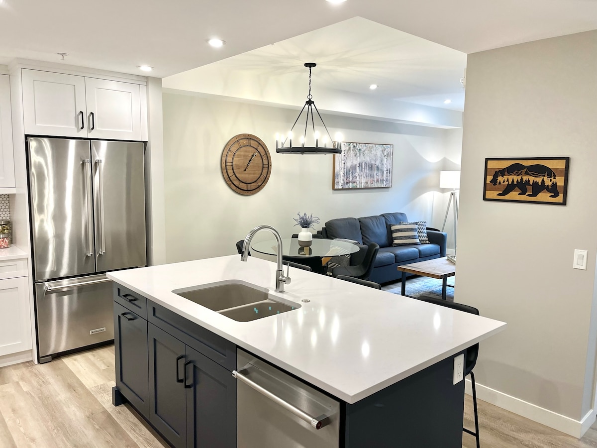 Kondominium dua bilik tidur baharu ini dilimpahi cahaya semula jadi, mempunyai pemandangan gunung yang menakjubkan dan menghadap sungai. Pelan lantai terbuka kontemporari, tempat yang berseni dan selesa yang boleh menempatkan sehingga 4 orang dan sesuai untuk pasangan atau keluarga. Terletak di pusat bandar, anda hanya beberapa langkah dari kafe, kedai dan restoran kegemaran anda. Anda berada beberapa minit dari bukit ski dan laluan basikal Moonraker/CBT dan betul-betul di laluan sungai. Pendaftaran Wilayah # H391623453
