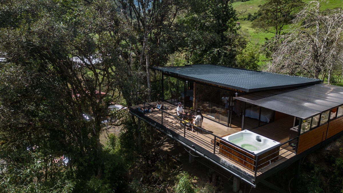 Suite bebas ini adalah ruang yang unik: ia menggabungkan keselesaan 5 bintang dengan katil queen, perabot pereka dan peralatan moden dengan patio hijau yang besar di mana anda boleh berehat di tengah-tengah alam semula jadi. Di taman anda boleh menuai buah-buahan dan sayur-sayuran organik anda sendiri (termasuk kopi). Ia sesuai untuk pasangan, mungkin dengan 1 kanak-kanak (untuk bayi ada katil bayi). Anda boleh berjalan kaki ke air terjun dalam masa 5 minit dan ke pusat bandar dalam masa 10 minit dengan kereta. Anda boleh meletakkannya di sebelah Suite dengan palam kereta elektrik