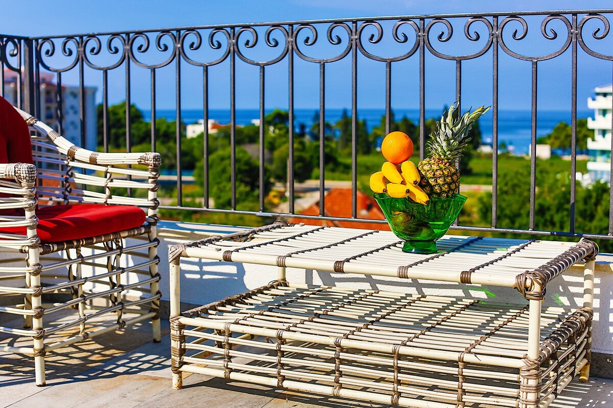 Apartmen dua bilik tidur (penthouse) dengan ruang tamu dapur yang besar. Penginapan selesa untuk hingga 5 orang. Pemandangan laut dan gunung yang indah dari teres besar ( 40 meter persegi). 7-10 minit berjalan kaki ke pantai. Dapur lengkap, tempat letak kereta. Pengambilan lapangan terbang boleh dilakukan). Penghawa dingin, TV, mesin basuh, ketuhar, peti sejuk, pengering rambut, seterika, linen katil, tuala.