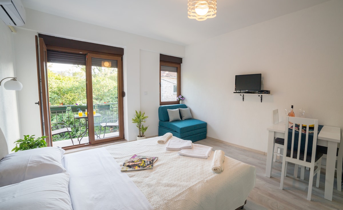 Studio ini mempunyai bilik mandi, katil Perancis, penyaman udara, TV LCD, peti sejuk, teres. Dapur dikongsi. Teres berkongsi yang besar. Kami terletak di antara pantai bandar dan pantai Štrbina dan Maljevik