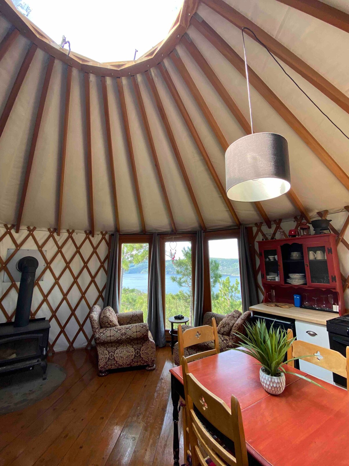 Berjarak 8 minit berjalan kaki, yurt kami menawarkan pemandangan fjord Saguenay yang paling indah, sangat mewah, ia dilengkapi dengan ketuhar propana dan peti sejuk, elektrik solar 12 Volt, air panas 22 liter sejam dan pancuran mandi. Peralatan tempat tidur disediakan serta semua peralatan untuk memasak. Setiap yurt mempunyai tandas tangki, terdapat juga kabinet lubang kering di luar. Pemanasan dalam cuaca sejuk adalah pembakaran kayu . Tapak perkhemahan mewah sebenar yang kami panggil GLAMPING.