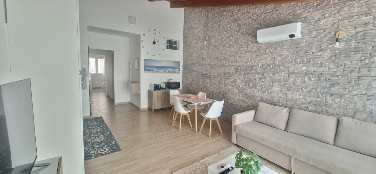 Appartamento indipendente, di nuova ristrutturazione e rifinito nei dettagli, è dotato di due ampie camere doppie con relativi bagni completamente accessoriati; soggiorno con smart tv a schermo piatto, connessione WI-FI, cucina con lavastoviglie forno e forno a microonde ; lavatrice, impianto di riscaldamento e aria condizionata. L'appartamento è situato in pieno centro, circondato da bar, ristoranti, negozi,piazze e chiese e distante pochi minuti dalle più belle spiagge del Sinis.