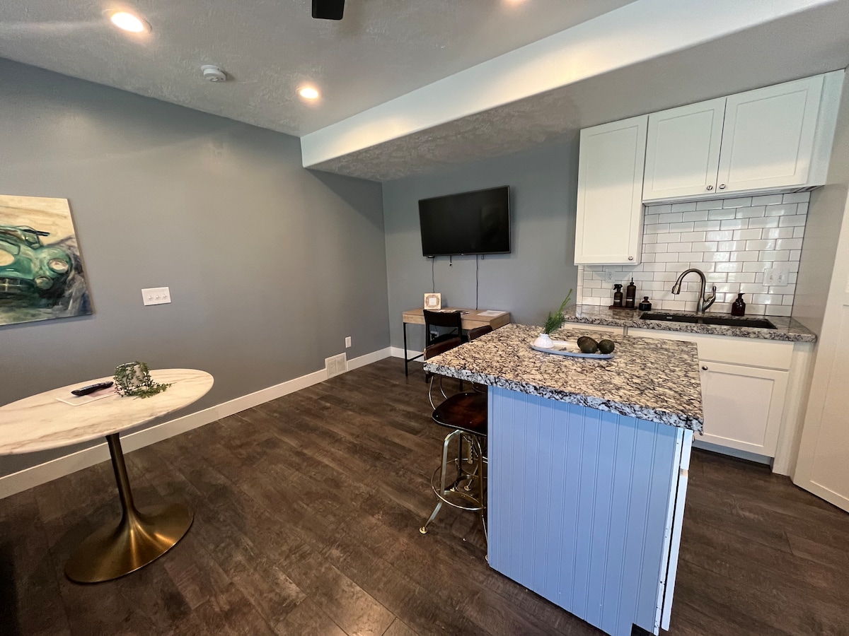 Bersantai di ruang yang tenang dan bergaya ini. Pusat ke Ogden, bandar terletak kira-kira 5 minit jauhnya, dan resort dalam masa 30-45 minit. Terletak di kawasan kejiranan yang tenang dan selamat, tempat ini mempunyai semua yang anda perlukan untuk penginapan perjalanan anda; menampilkan dapur kecil, mesin basuh/pengering, bilik mandi, katil queen murphy, meja makan, kawasan duduk, meja kerja, WIFI, Kabel, dan tempat letak kereta percuma berhampiran pintu masuk persendirian. Tiada yuran pembersihan! Selain itu, tetamu mempunyai akses kepada petak luar untuk haiwan peliharaan yang sedang dalam perjalanan yang perlu berjalan-jalan.