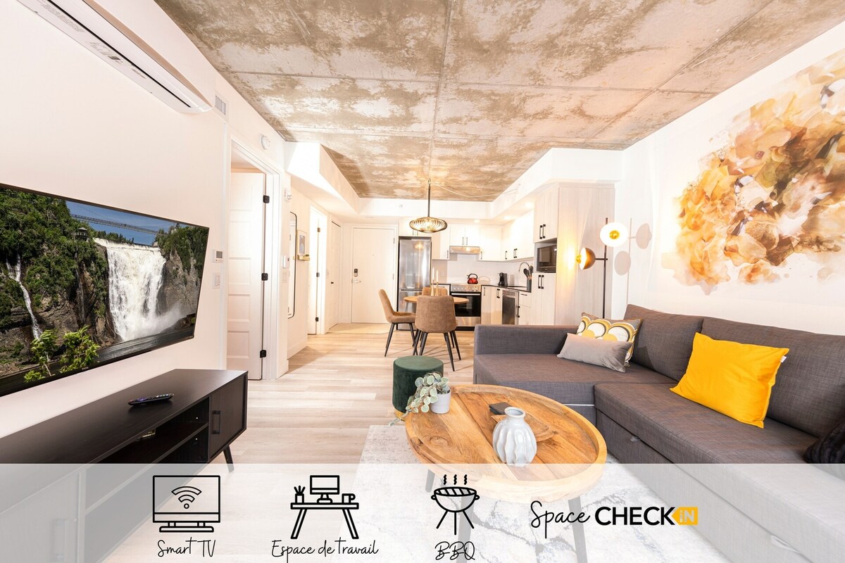 Datang dan nikmati penginapan yang tidak dapat dilupakan di tengah-tengah daerah Saint-Roch di Quebec City. Kondominium moden dan mewah ini akan memikat anda dengan ruang umum seperti reka bentuk dalaman. Termasuk Tempat Letak Kereta ✧️ Dalaman Teres ✧️ bumbung dengan kolam renang, ruang makan & pendiangan luar ✧️ BBQ tersedia sepanjang tahun di atas bumbung. Bilik ✧️ kecergasan Apartmen yang✧️ cerah dan menyenangkan Wifi ✧️ pantas dan ruang kerja ✧️ Hanya 15 menit berjalan kaki ke Old Quebec