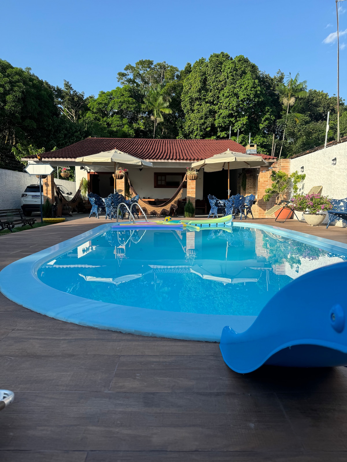 Casa grande em condomínio fechado. Casa completa com 3 suítes confortáveis. Quintal grande com churrasqueira, chuveiro, mesas e cadeiras externas, rede, piscina de plástico e pula pula. Garagem para 6 carros. Nesta casa você estará no centro da Cidade, mas dentro de um Condomínio com clima de interior. Estará a menos de 10 km do aeroporto e do Hangar, na principal Rodovia de acesso à Belém (Br 316), mas em um condomínio bem reservado, com bosques, lagos e poderá acordar com o som de pássaros