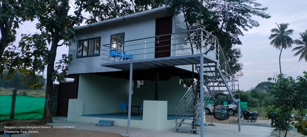 Terletak di Bengaluru Selatan, di luar jalan Kanakpura, di hutan mangga dan kelapa seluas satu ekar, salah satu daripada enam kabin kontena mewah ini adalah pelarian anda daripada huru-hara landskap bandar. Dengar kicauan burung dan gemerisik daun dalam angin sepoi-sepoi. Sarapan adalah percuma dan makanan lain boleh dipesan dalam talian di Swiggy atau Zomato. Kolam renang dikongsi. Menunggang kuda dan zip lining adalah aktiviti percuma. Semua kabin mempunyai penyaman udara.