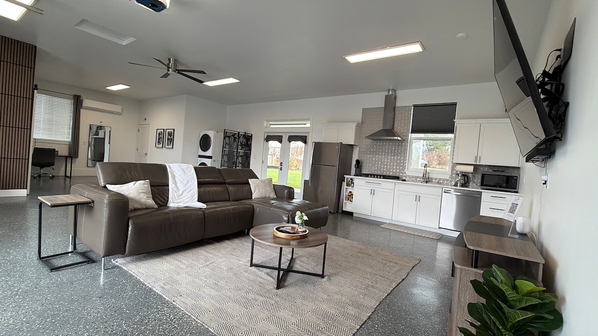 Studio perpustakaan kami yang menawan dan selesa menampilkan katil Queen kayu ceri yang cantik dengan peralatan tempat tidur seperti awan dan banyak bantal empuk untuk berpelukan atau membaca di atas katil. Selesa, damai, dan terasa seperti di rumah sendiri. Pendiangan kayu, ruang tamu teater rumah dengan TV 65”, meja untuk kerja jarak jauh, ketuhar gelombang mikro, peti sejuk, bilik mandi dengan pancuran mandi, serta mesin basuh dan pengering dalam unit. Pintu masuk peribadi anda mempunyai patio teduh untuk bersantai, dikelilingi oleh halaman belakang yang terpencil seperti taman. Wain tempatan atau sider berkilauan disediakan untuk anda nikmati.