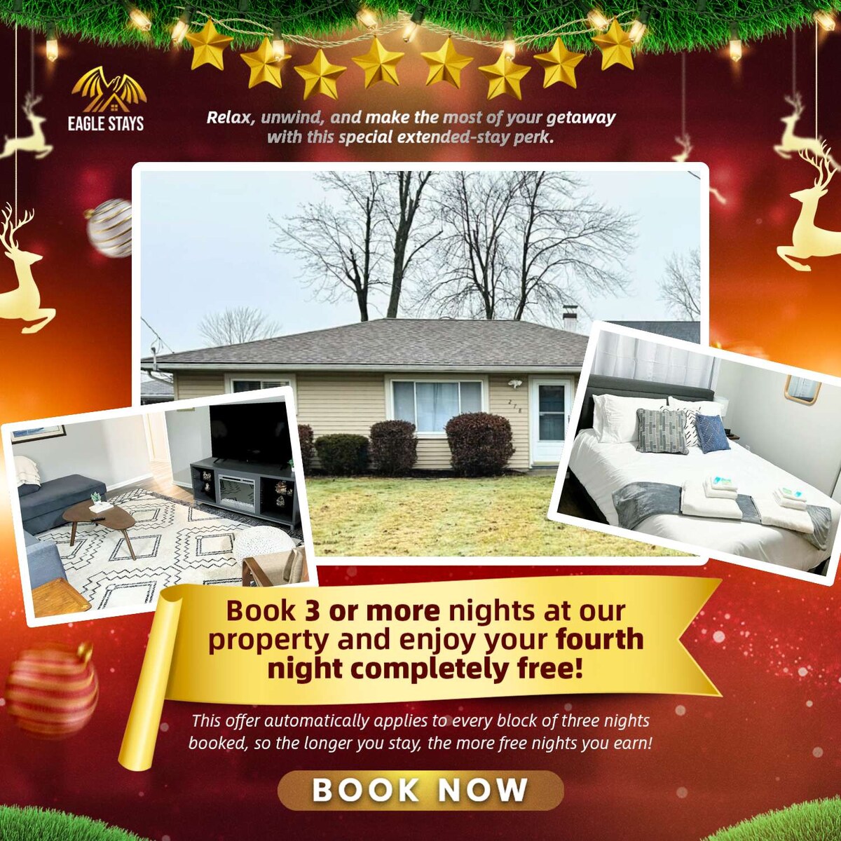 Buat kenangan di percutian kecil yang selesa ini di tengah-tengah Olmsted Falls. Rumah ini mempunyai dapur lengkap dan gril barbeku untuk kegunaan anda. Halaman belakang mempunyai pagar privasi dan lubang api. Jika anda lebih suka menginap, terdapat banyak permainan untuk dimainkan serta papan dart di ruang bawah tanah. Rumah ini dilengkapi dengan smart TV dan internet berkelajuan tinggi. Katil-katilnya hangat dan selesa dengan cadar, selimut dan selimut yang dicuci segar. Dua bilik tidur di bawah dan satu di atas. Satu bilik mandi di tingkat bawah